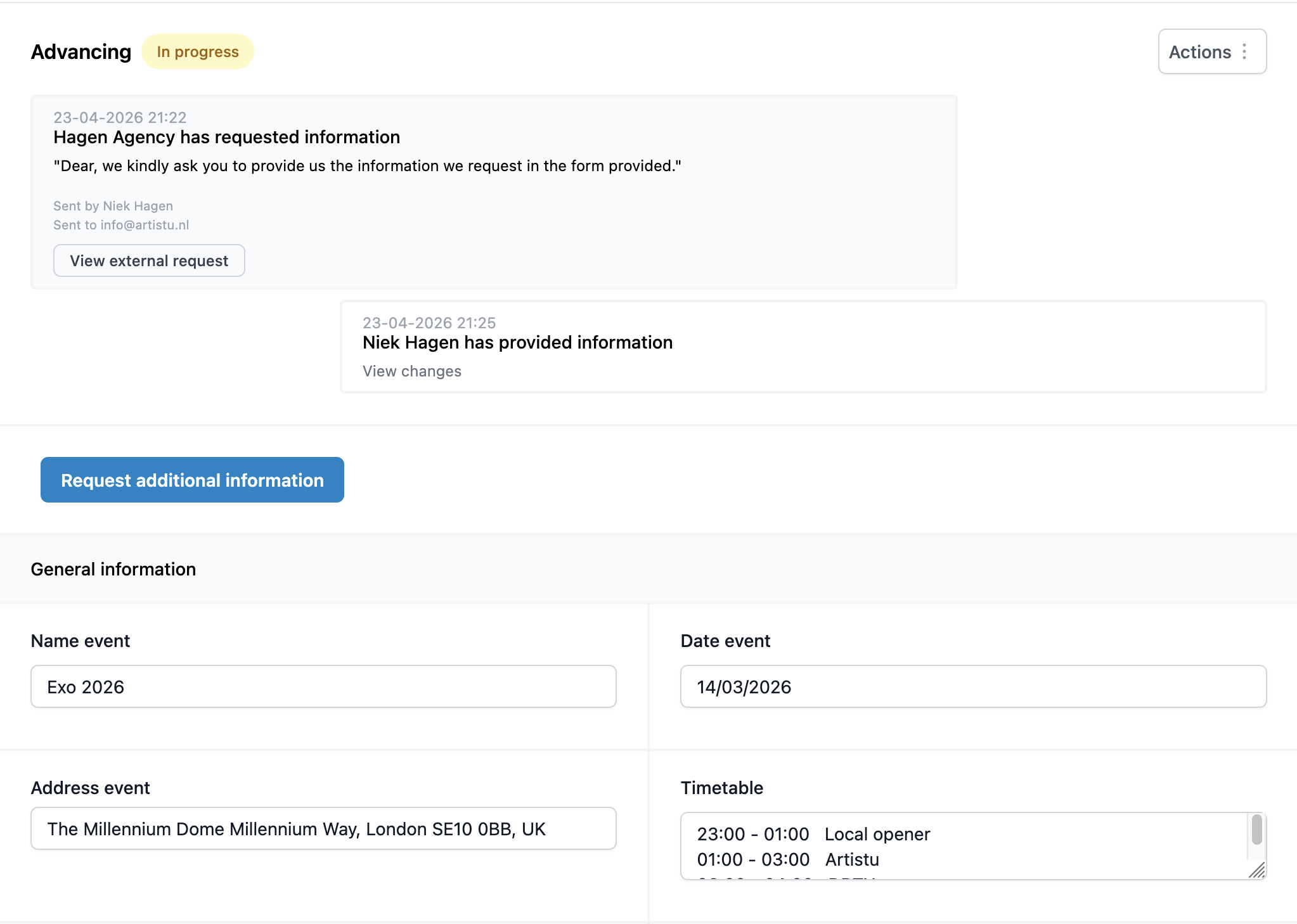Artistu gives you a single view across every booking on your roster, with status at a glance: inquiry, option, hold, confirmed, or cancelled. Artists see their confirmed shows without you forwarding details manually.