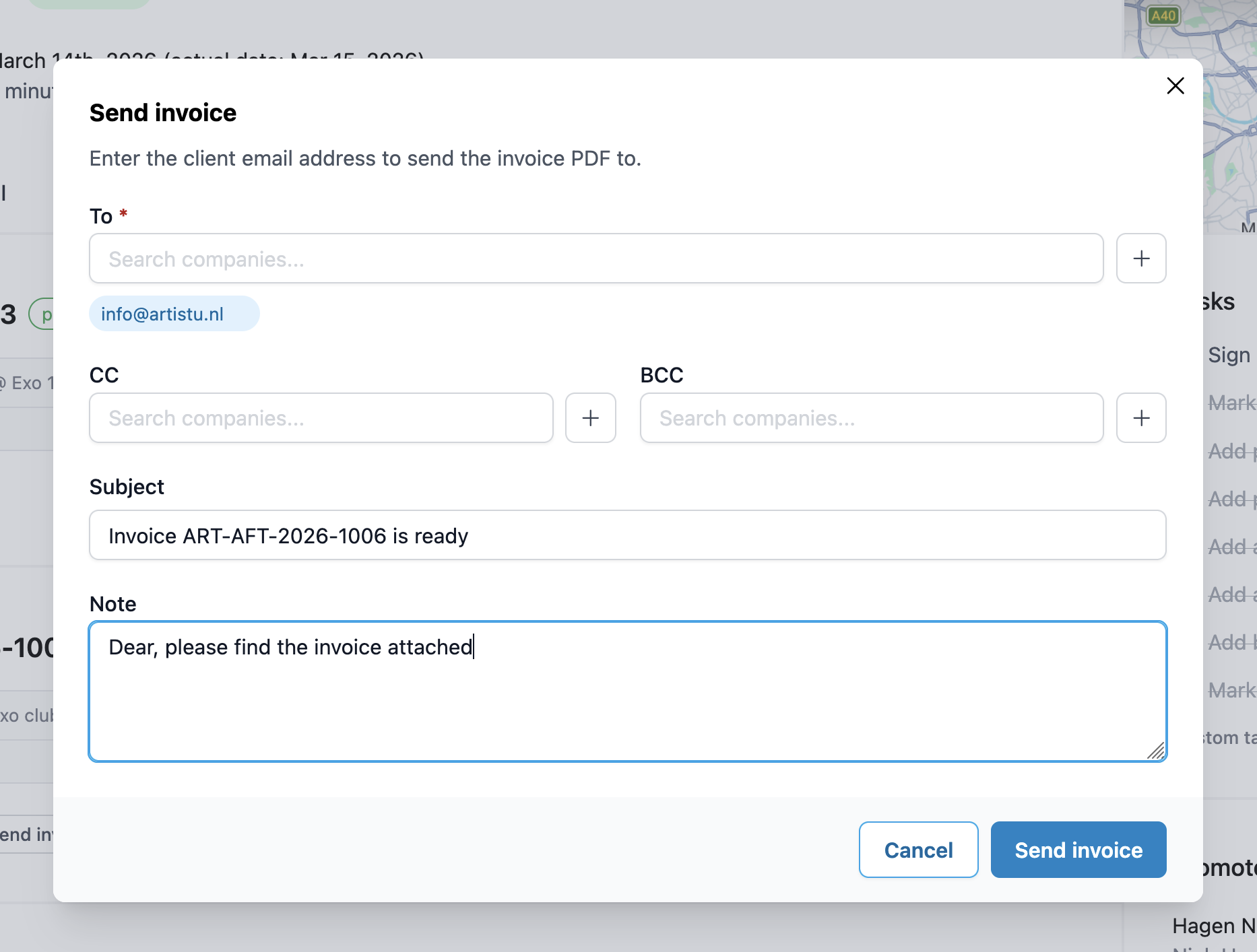Generate an invoice from your booking in two clicks. Email it directly to the client, or send via Peppol e-invoicing for EU agencies. The invoice lands in your client's accounting system without anyone printing or attaching a file.