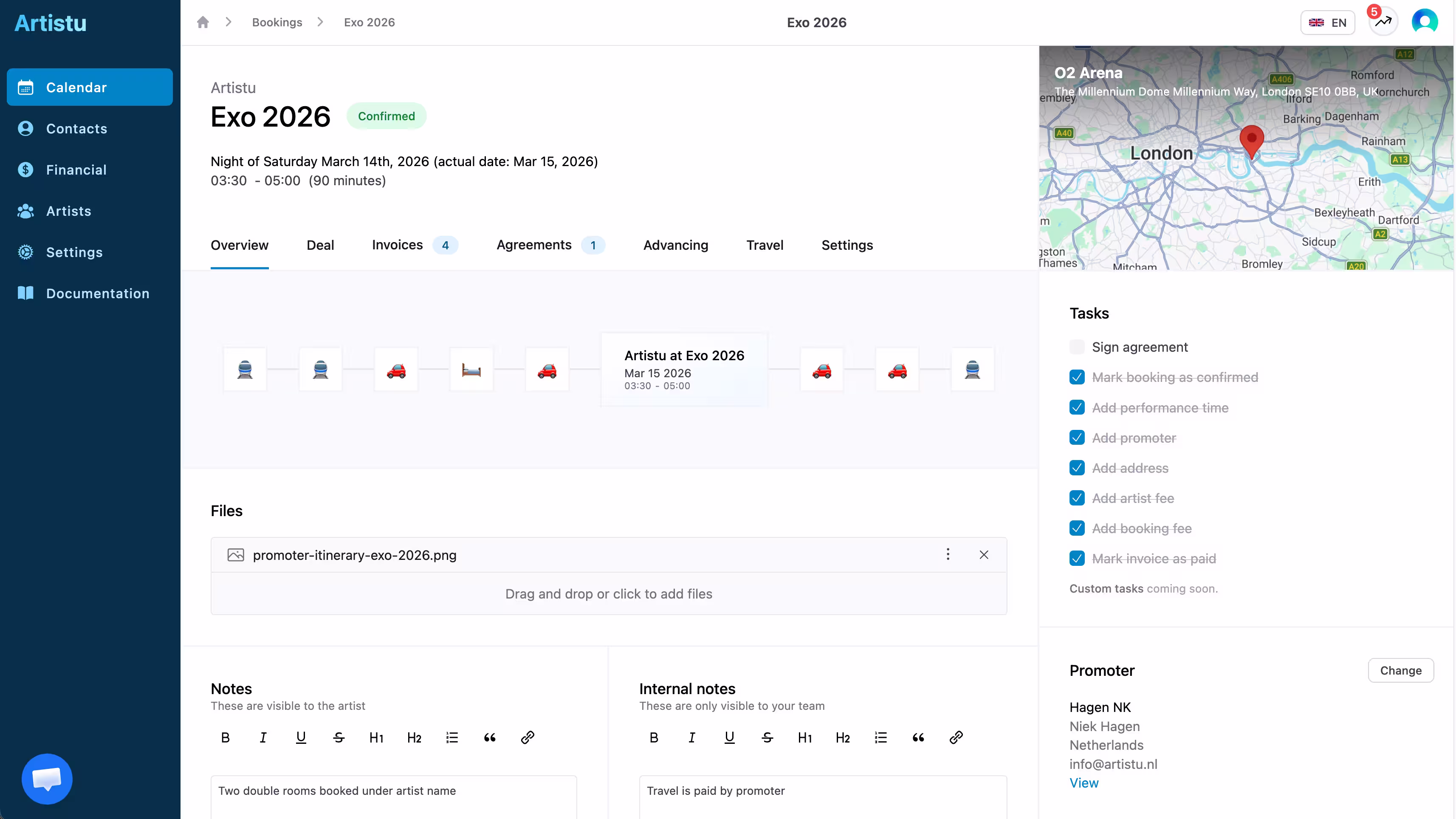 Handle technical riders, DJ booth requirements, and festival logistics from the same system you use for bookings. Artistu has strong adoption among agencies on the electronic and festival circuit.
