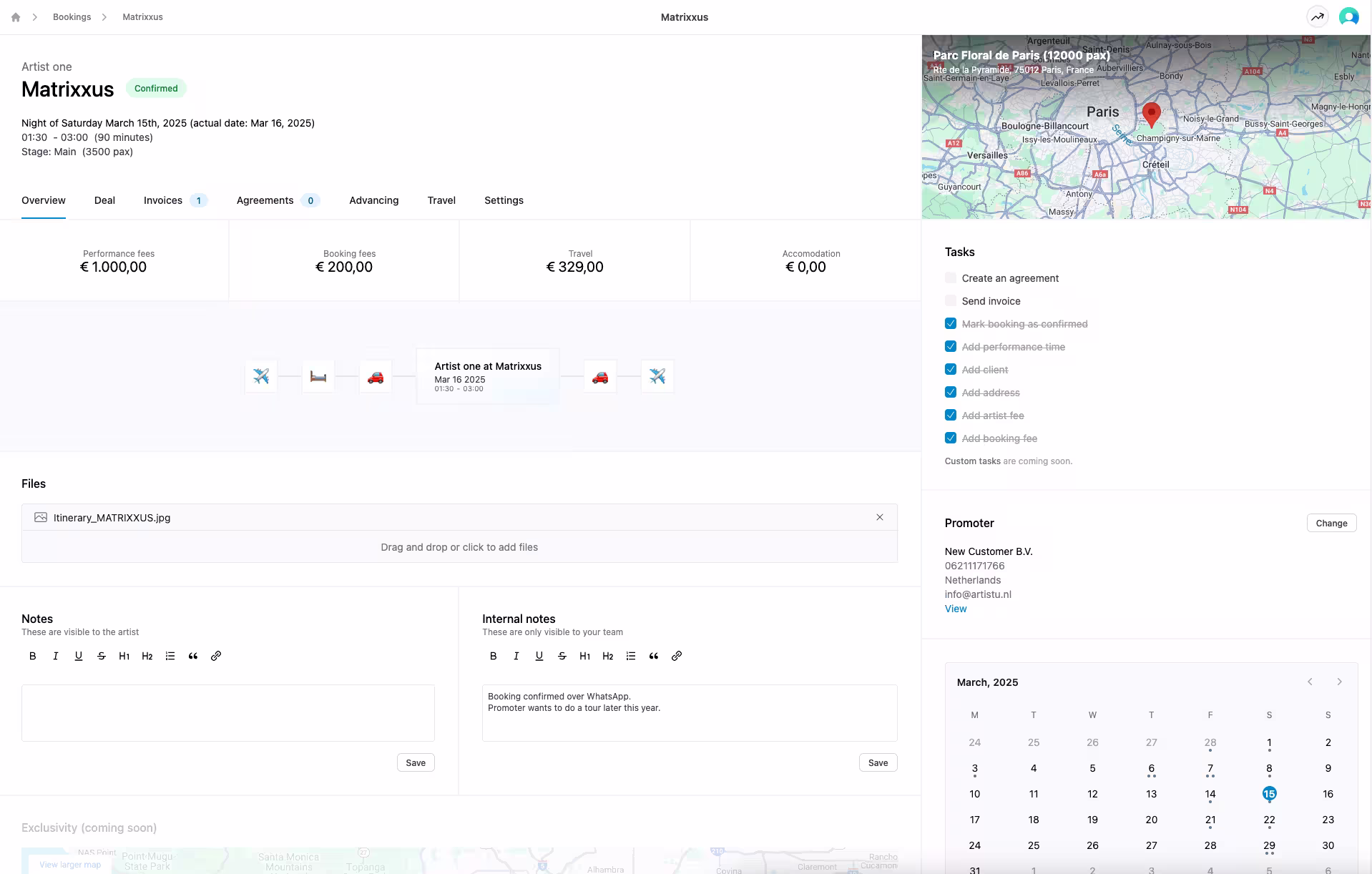 Logistics now includes more space and structure for travel-related details. Whether it’s flights, hotel bookings, or local transport, you can enter and review all the necessary information in one consistent place. It’s easier for artists and managers alike to know where they need to be and when.