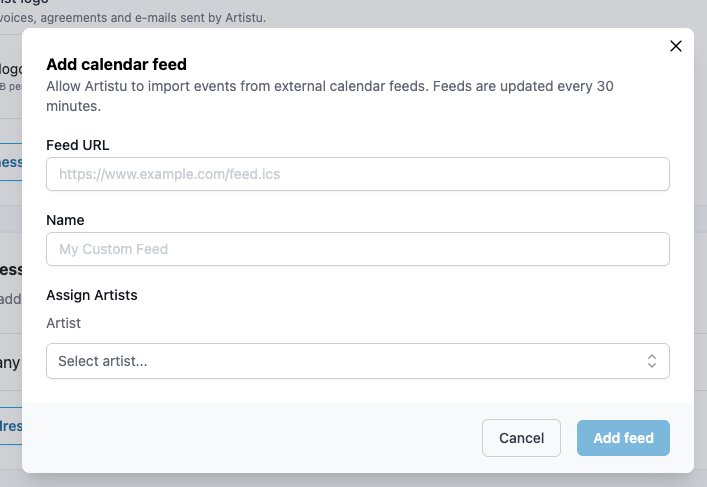 Artistu has always let you push your roster to Google Calendar, Apple Calendar and Outlook via iCal. Now it works the other way too. You can subscribe to external iCal feeds and they show up right next to your Artistu bookings.