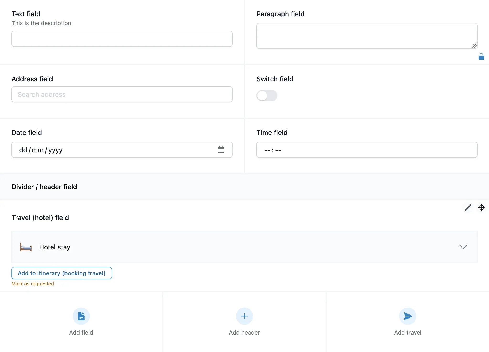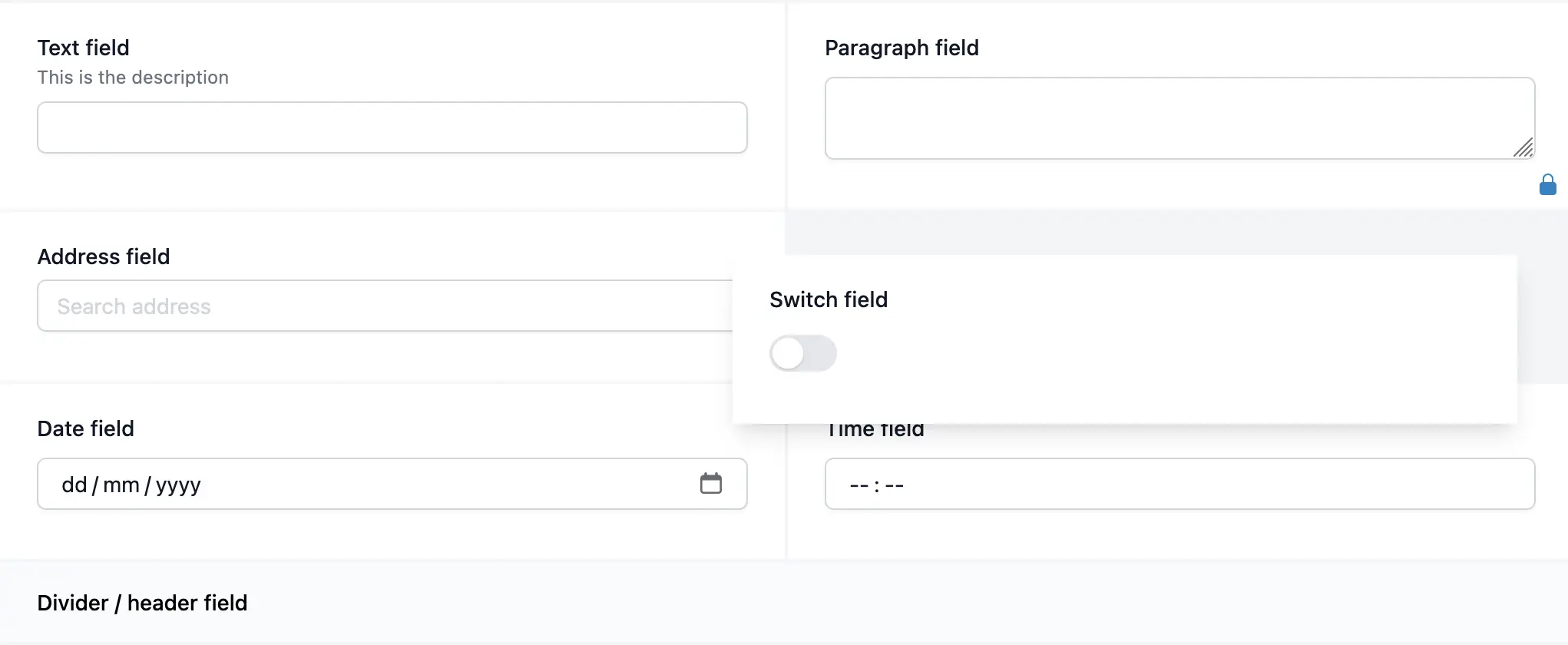 - Headers / Dividers: To organize your form structure.