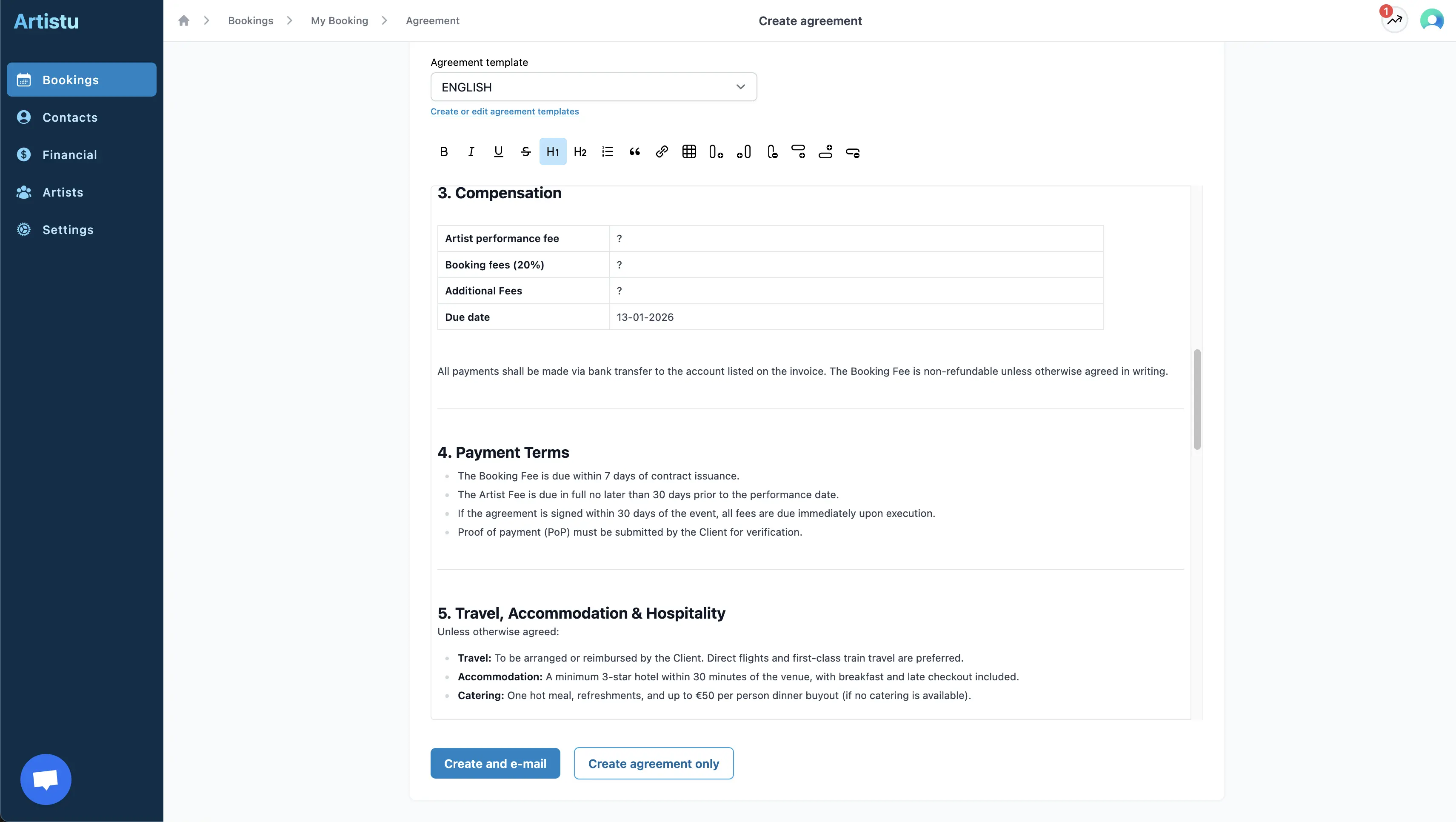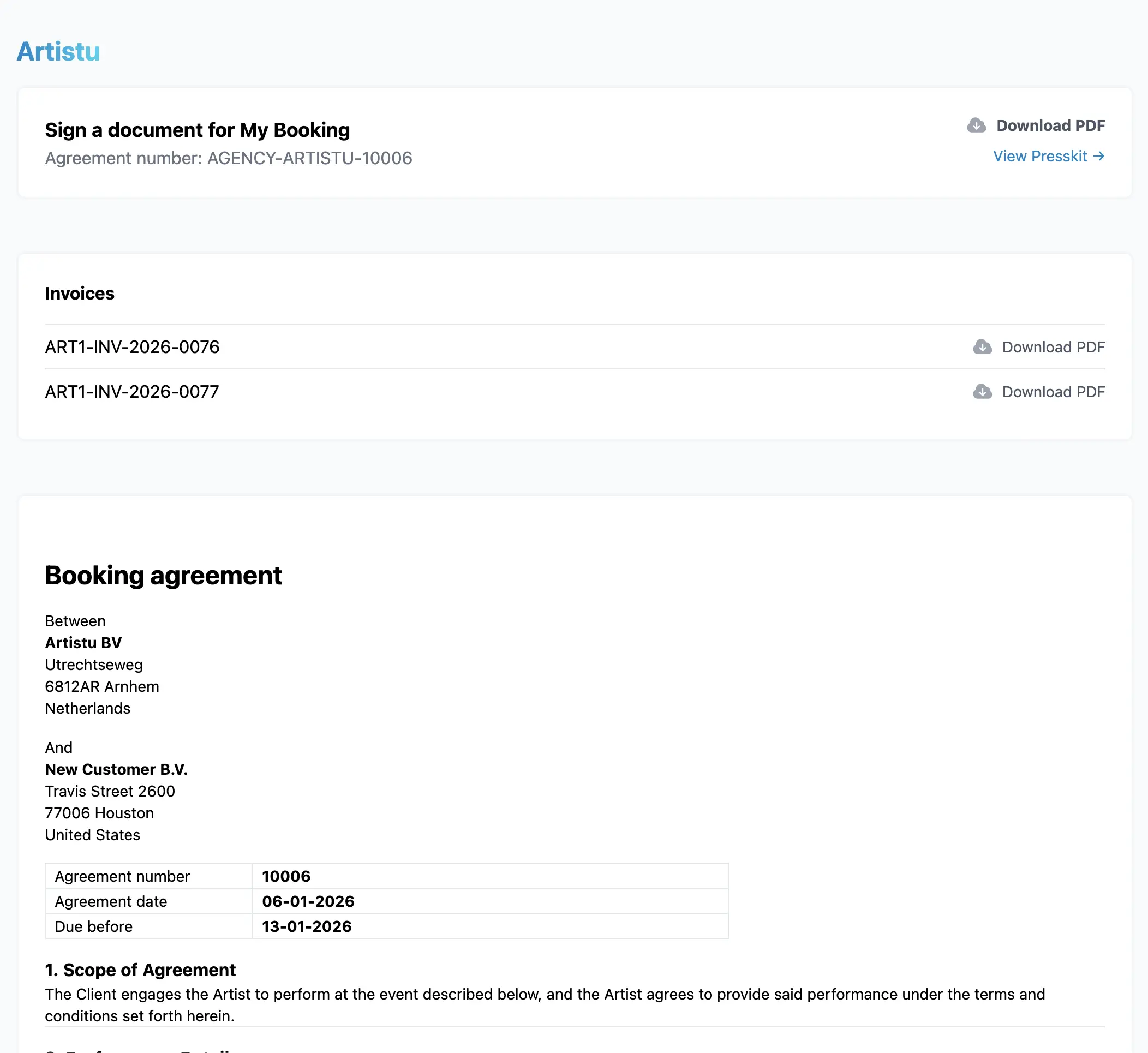 Artistu allows you to send your agreements for digital signature directly from the platform. This streamlines the booking process and keeps everything in one place.