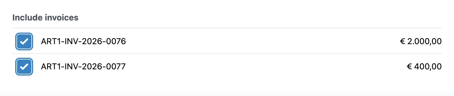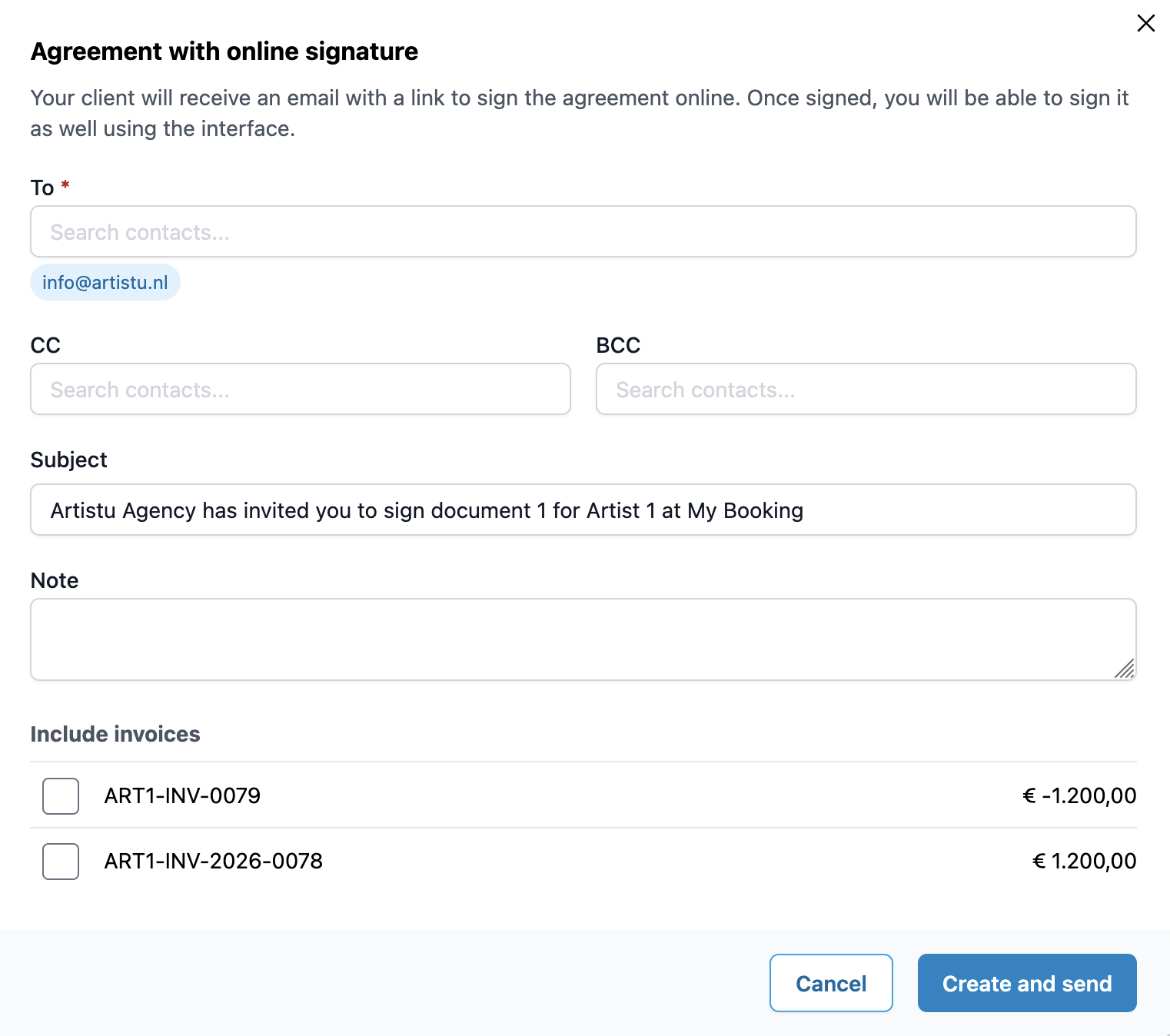If you have created invoices for this booking, you can choose to include them in the signature request. This way, the promoter receives everything they need in one go.