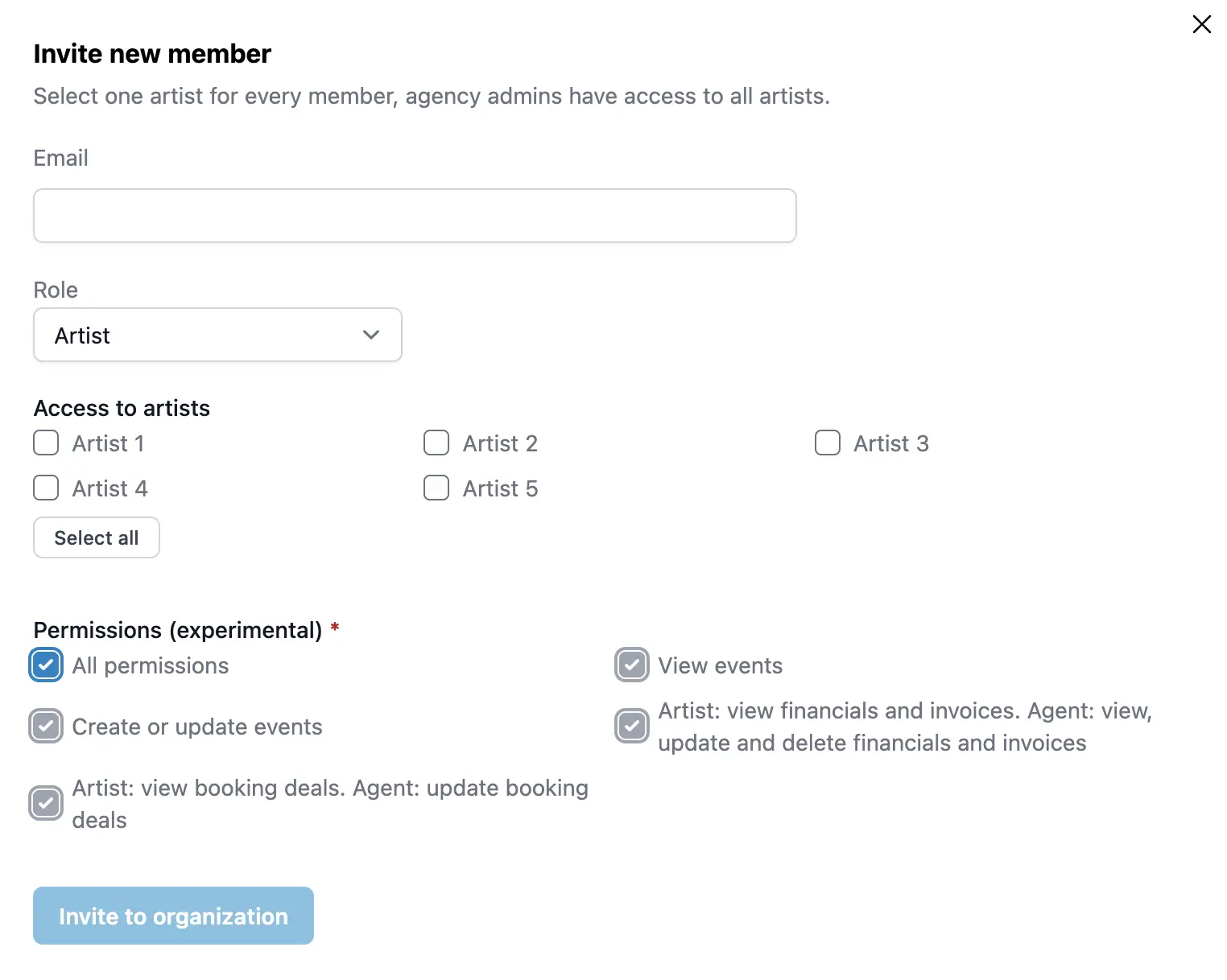When inviting an artist, you can specify exactly what they can or can't do with permissions. This allows you to control the level of access each artist has to their data.