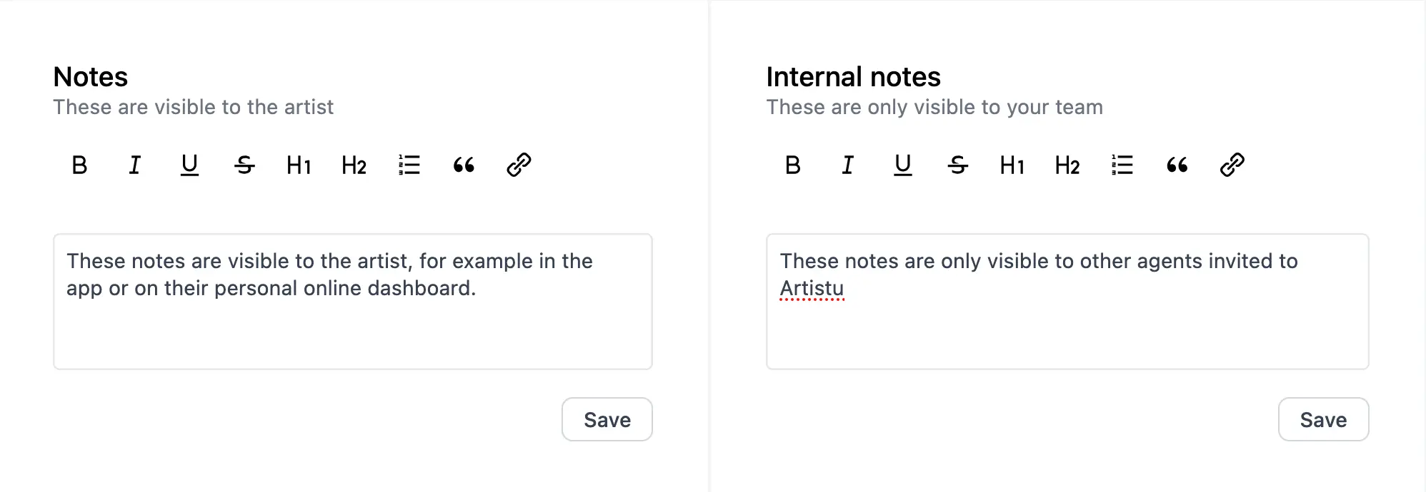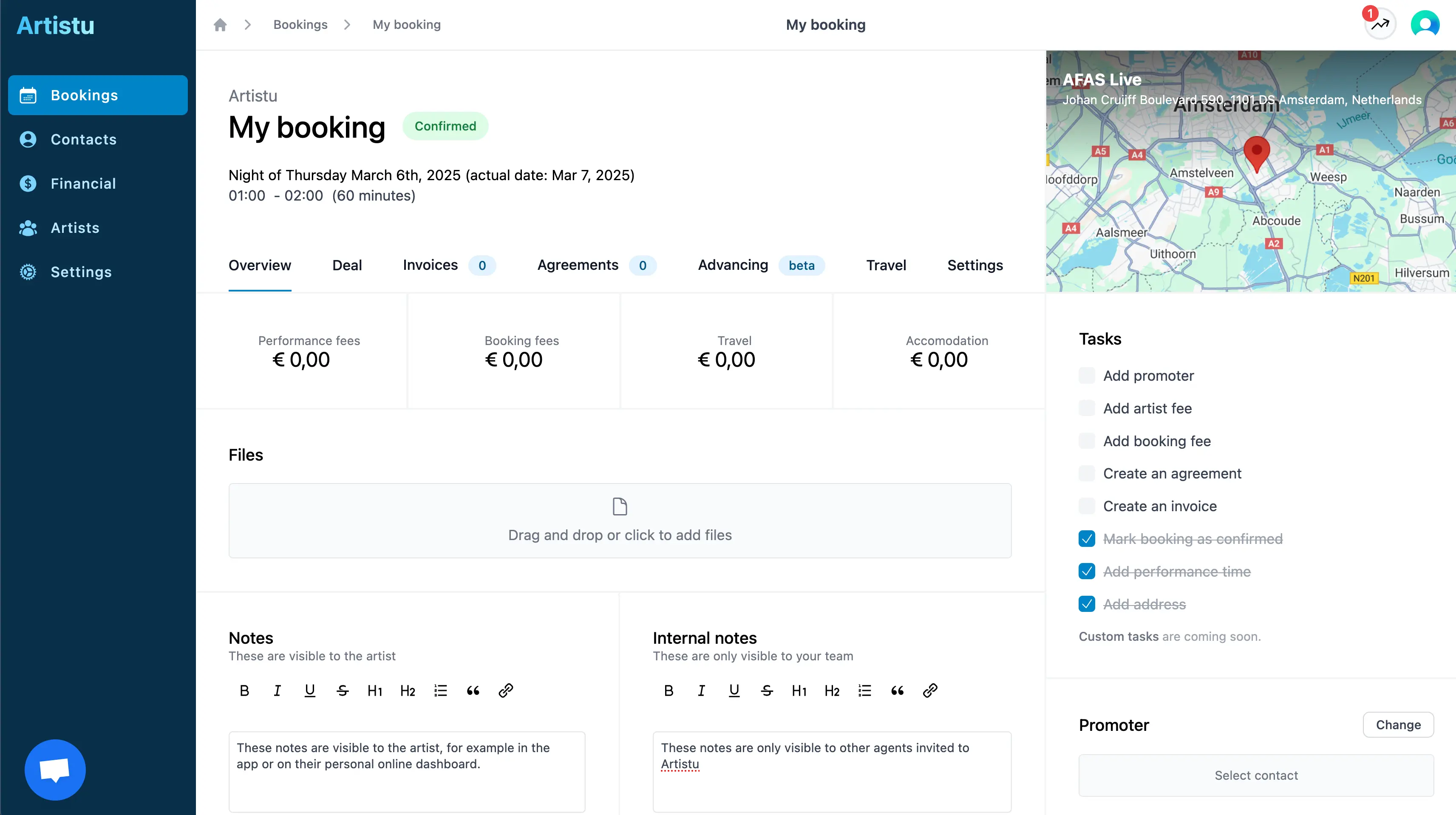 Artistu also allows you to add internal notes to the booking. These notes are only visible to you and your team.