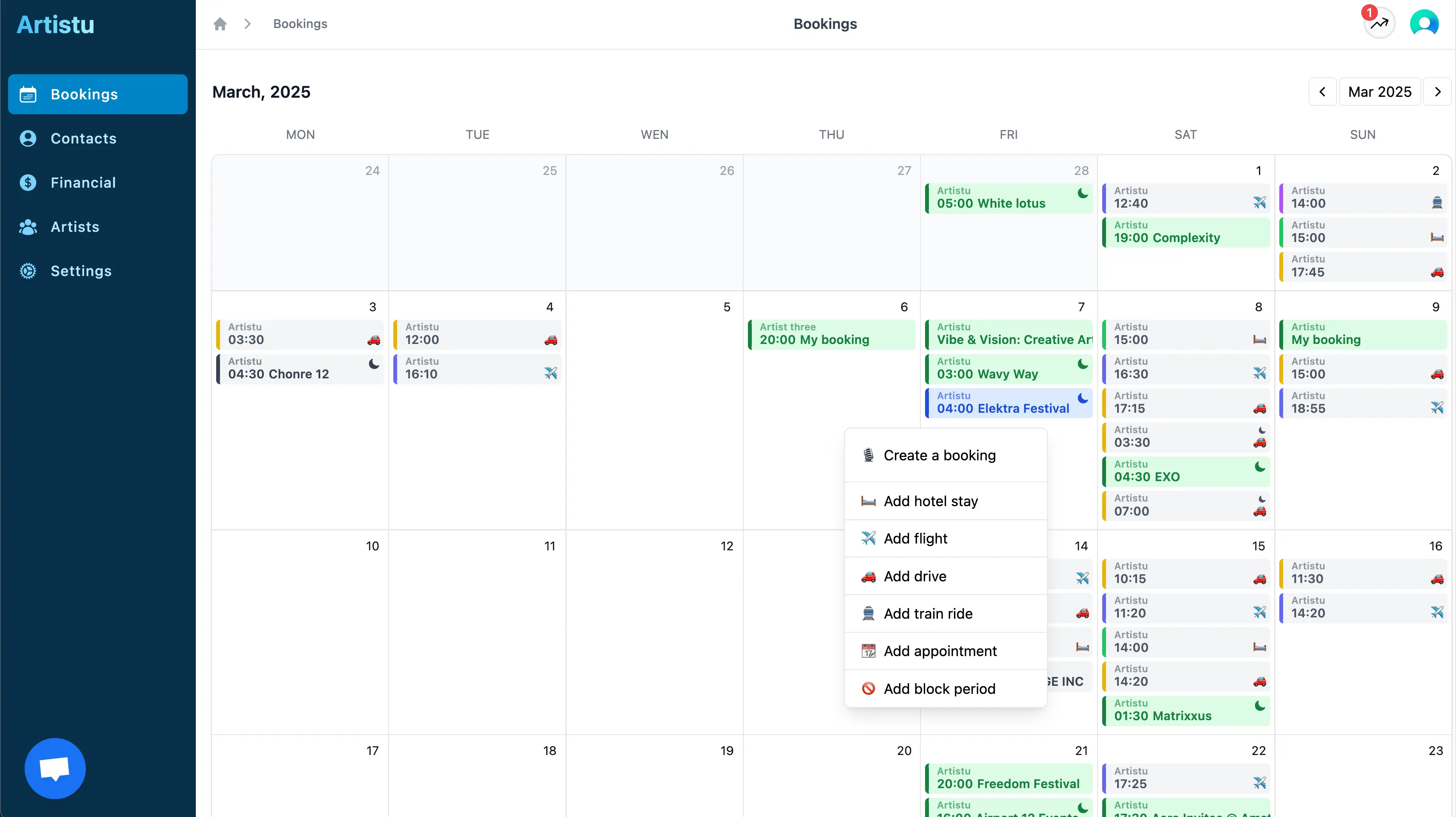 Creating a booking in Artistu