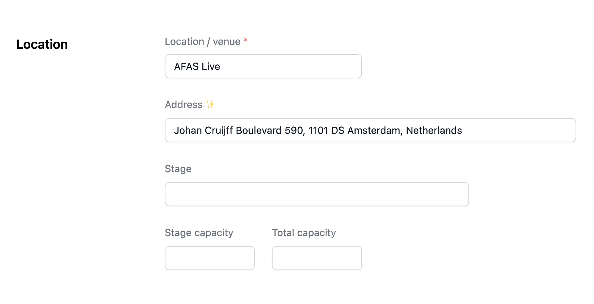 After creating the booking and heading to the "settings" tab it is advised to provide necessary information about the performance such as the venue, stage, capacity and address.